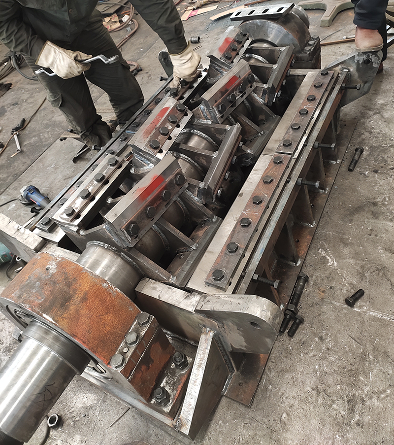 该机主厢体有双层钢板焊接而成,隔层加立焊加强筋,提高了主厢体的抗冲击抗疲劳能力,内嵌底刀使用更安全,拆卸更方便。可调式六刀主轴保证同心度的同时减小了主轴轴承轴承座的承载能力。下层厢体设计有双侧开合口,禁锢型活筛底根据料质不同随时可以由开合口去除更换。
